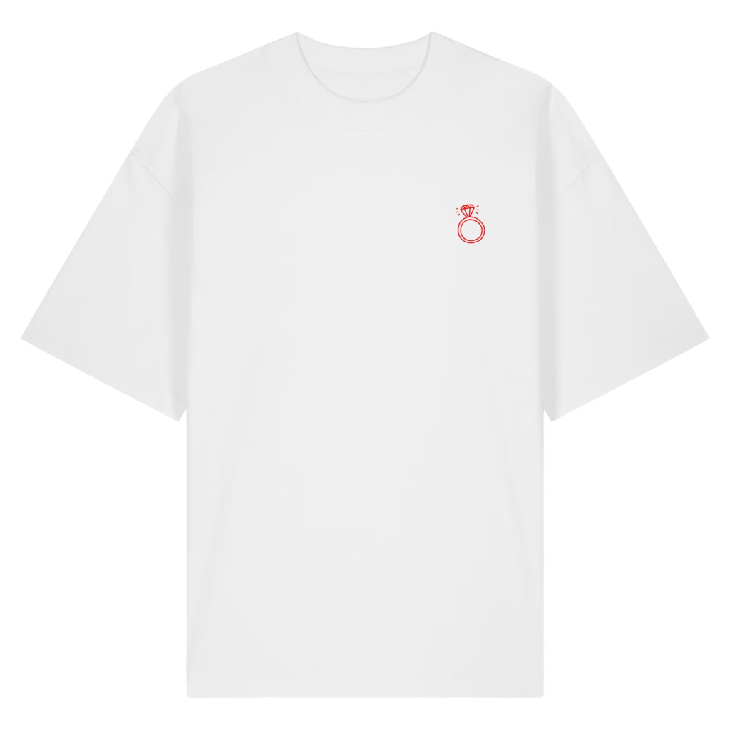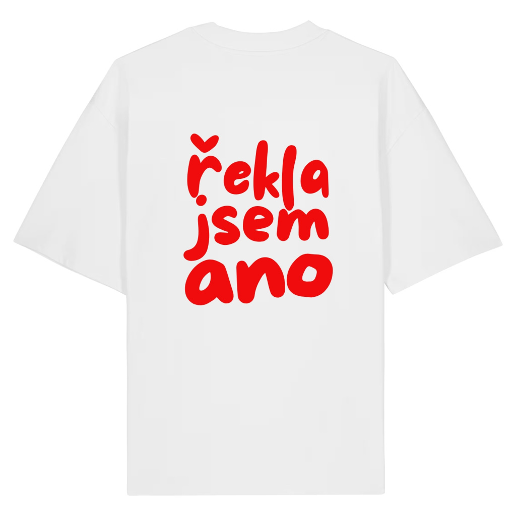 Bílé tričko s jemnou ikonou prstenu na přední straně a velkým nápisem Řekla jsem ano na zádech je určené pro nevěsty, které chtějí svůj výjimečný den prožít s elegancí a stylem. Díky oversized střihu a gramáži 200 g/m² se tričko skvěle nosí a působí uvolněně i slavnostně zároveň. Perfektně ladí s tričky pro tým nevěsty Ona řekla ano.