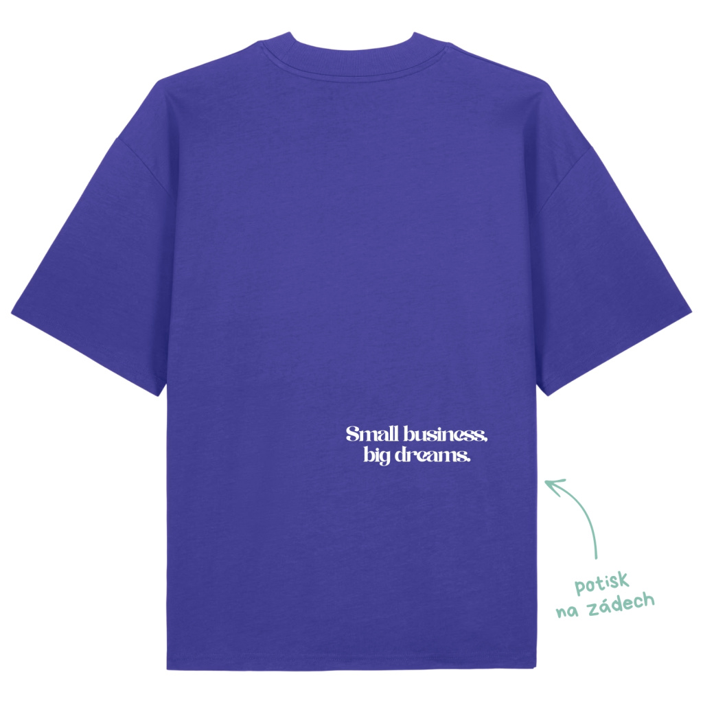 A tím je vlastní cesta, i když začíná v malém. Toto modré tričko s potiskem „Small business, big dreams“ na zádech je poctou všem, kteří tvoří, podnikají a dělají to srdcem. Díky oversized střihu a gramáži 200 g/m² se tričko příjemně nosí každý den a zároveň působí sebevědomě a uvolněně. Přední strana je bez potisku, abyste si ho v klidu mohli vzít na jakoukoliv schůzku.